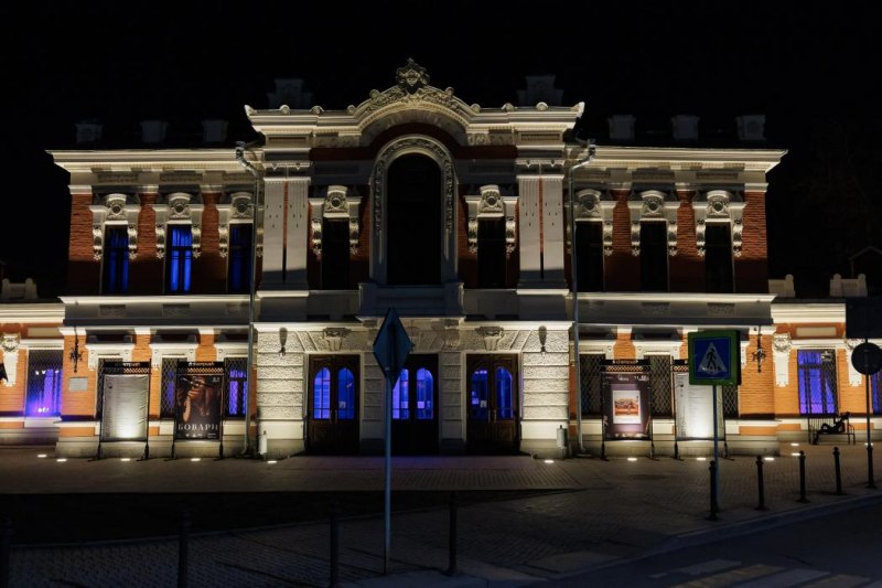 Псковский академический театр драмы имени А. С. Пушкина, подсвеченный синим цветом в рамках акции.