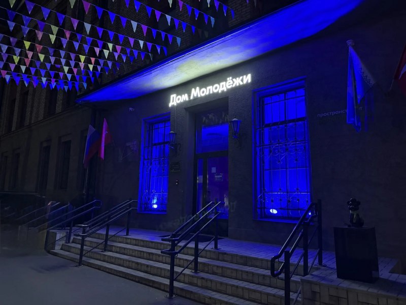 Региональный Дом молодежи в Псковской области с синей подсветкой.