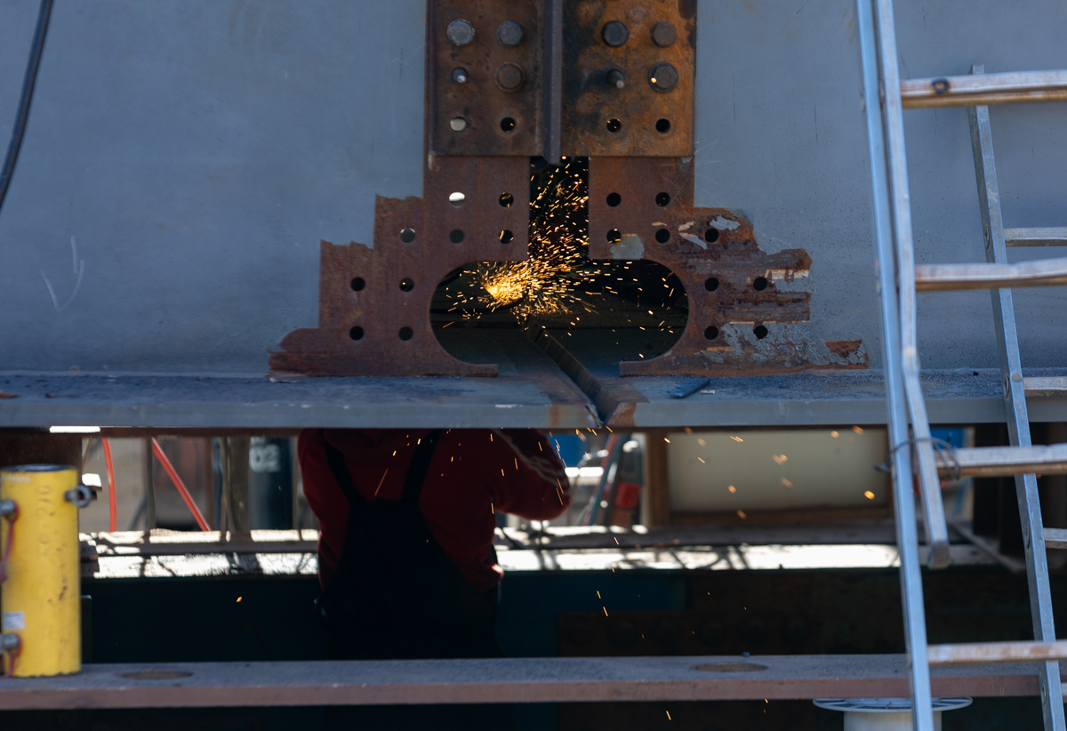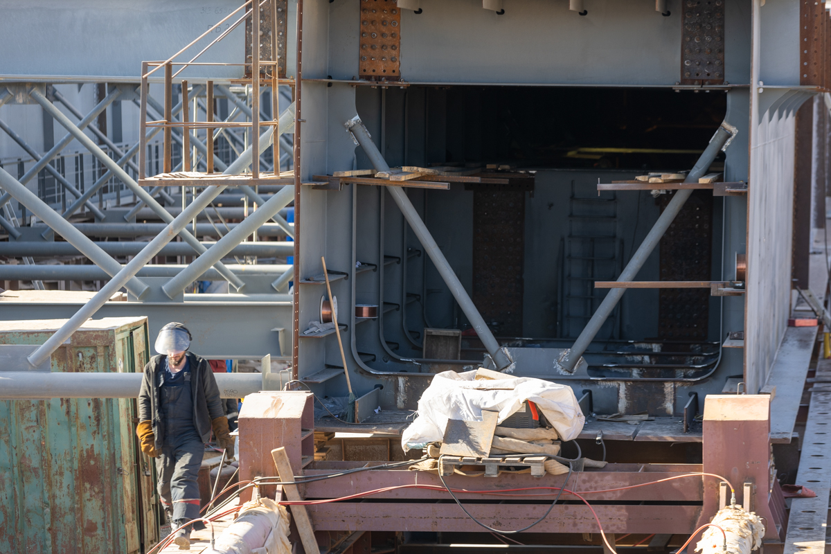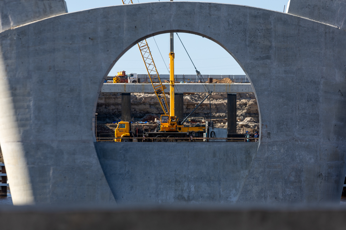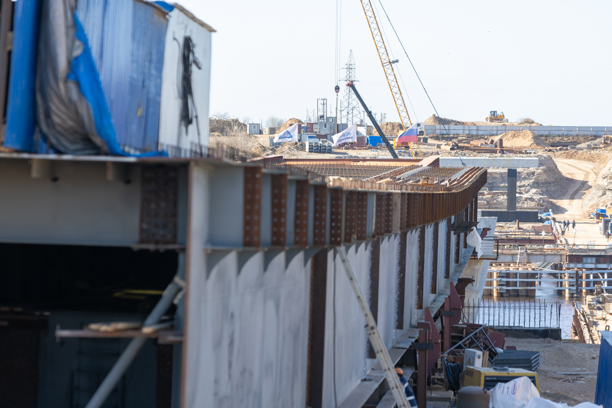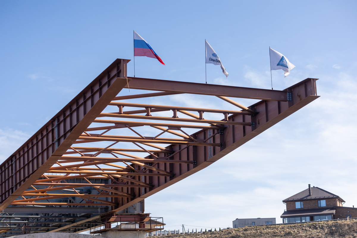 Металлическое пролётное строение собирают на стапельной площадке на одном берегу, после чего с помощью толкающих устройств его надвинут на русловые опоры и крайнюю опору на левом берегу. Этот метод, известный как технология надвижки, позволяет минимизировать воздействие на водную среду и значительно сократить сроки строительства. Ранее подобный подход успешно применялся при возведении Крымского моста, где он позволил ускорить монтаж примерно на 40% и повысить точность установки.