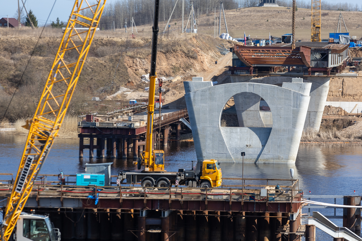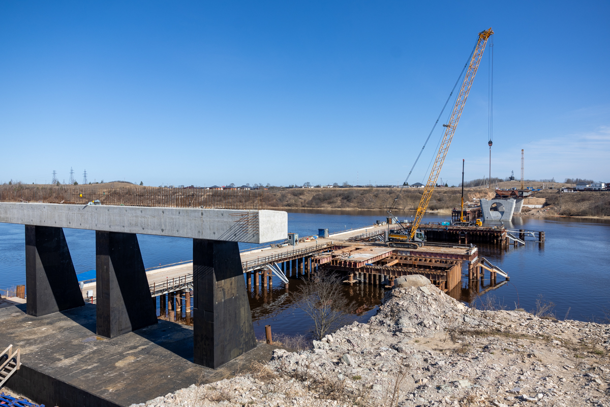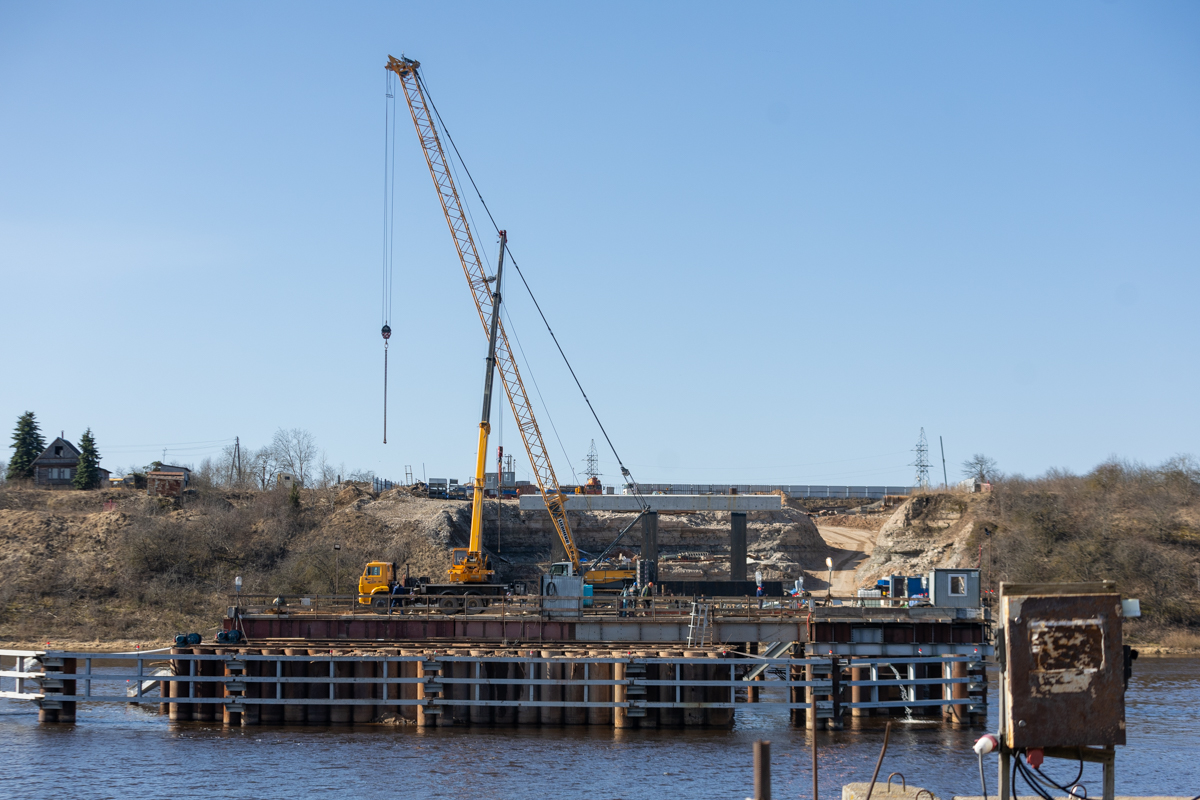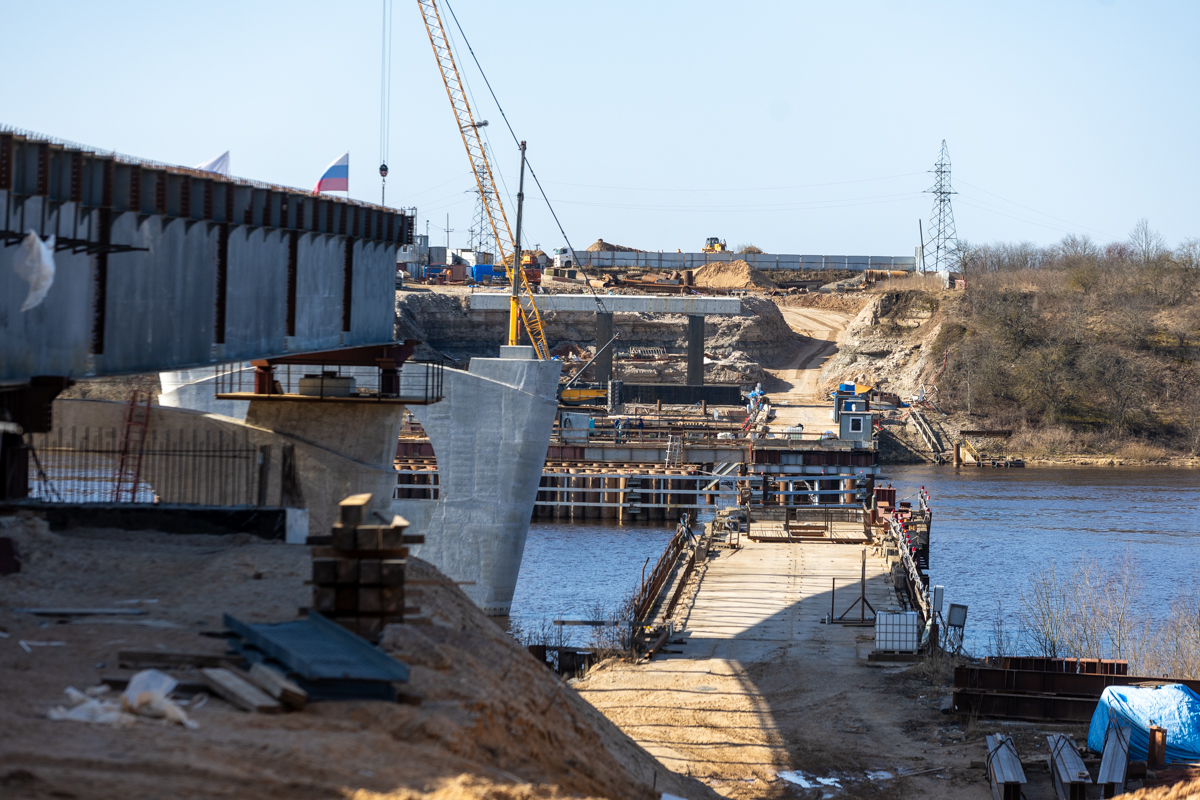 В Псковской области активно строят ключевой мост через реку Великая в рамках проекта Северного обхода. Сейчас ведутся работы по возведению опор, а для монтажа применяется технология надвижки, использовавшаяся при строительстве Крымского моста.
